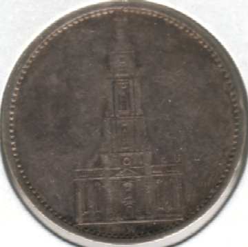 5 Reichsmark (silver) 1934D 83 ger5ub.jpg (97242 bytes) ger5ubx.jpg (75082 bytes) Potsdam Garrison Church   two minor edge knocks VF 10.00