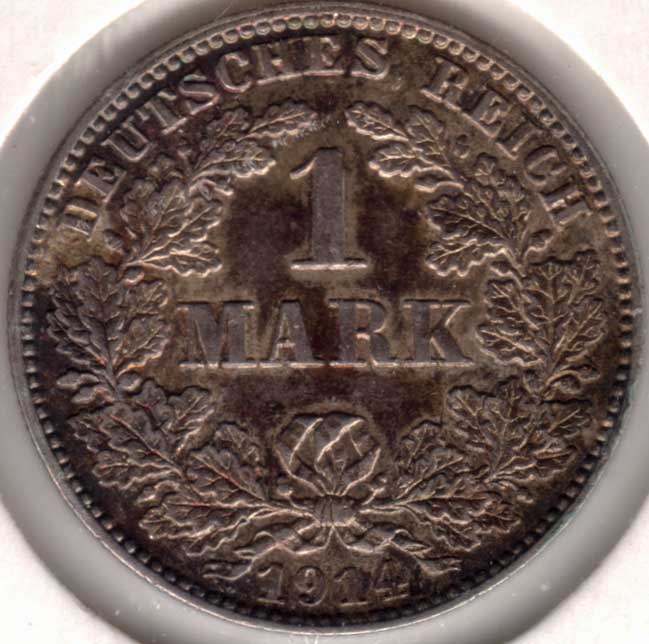 1 Mark (silver) 1914A 14 germany1mark1914xf.jpg (16093 bytes) germany1mark1914xfx.jpg (12748 bytes) Obv light tone/Rev dark tone GEF 6.00