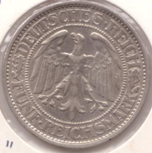5 Reichsmark (silver) 1931A 56 g1931.jpg (26880 bytes)  g1931x.jpg (27536 bytes) Oak Tree GVF/EF 65.00