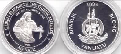 50 Vantu (silver) 1994 22 vankm22.jpg (12168 bytes) Queen Mother Lady of the Century & End of Victorian Era  with COA Gem Proof 33.00