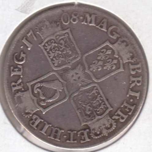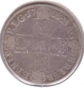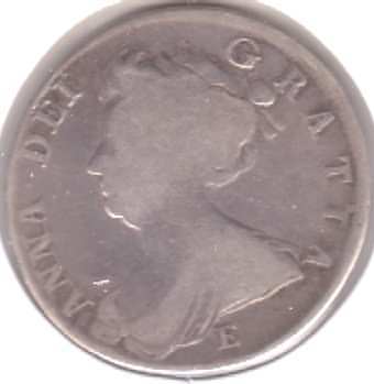| 1708E silver | ESC 576 E below bust minor adjustment marks on Rev 1 in date Z edge SEPTIMO Queen Ann | VG | 55.00 | |