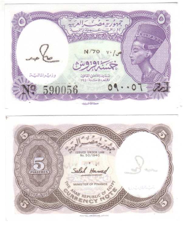 5 Piastres L.1940 182j egyptp182jn70.jpg (60770 bytes) Series N70 UNC 1.75