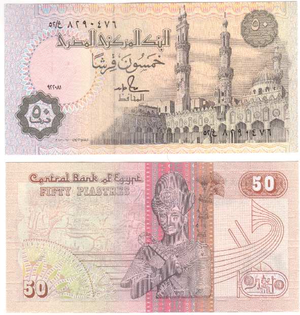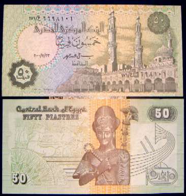 50 Piastres 23.11.2000 62?  egyptp62.jpg (24576 bytes) Sign 19  Al Azhar Mosque ser 171 date not listed UNC 0.50