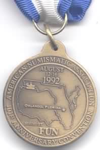 ANA (American Numismatic Association) ANA Medal 101st Anniversary Convention 1992.Bronze medal with ribbon & name plate size 33mm Rev Steam Train on bridge with Alligator below . Mint state in box |