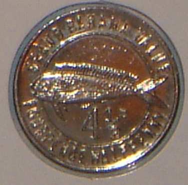 Bahamas 4½d (Fourpence Halfpenny) Token. Silvered Brass 18mm undated. Rev Dolphin. Used in Grand Bahama Hotel and Country Club |