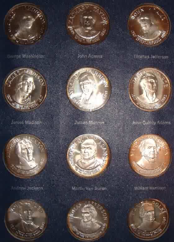 Silver Proof Medals United States of America Presidents. George Washington to Richard Nixon 36 medals Obv Bust of president Rev History of president all contained in album of issue with booklet. A total content 35oz of pure silver, each medal being .925 sterling silver weighing 32.5 gram dia 38mm.All struck to proof finish, some medals showing semi rainbow toning |